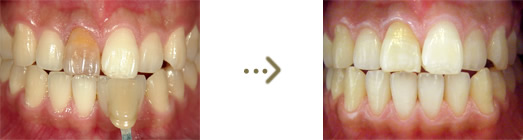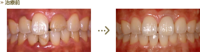 治療前・治療後の写真です。 歯周基本治療の後、歯肉のバランスを整えるため左上中切歯のみ歯周外科を行いオールセラミッククラウンで修復しました。
