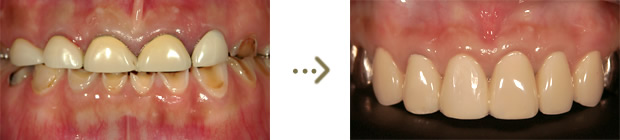 治療前・治療後の写真です。 歯周外科(歯冠長延長術)を全顎的に行い、レジン前装鋳造冠にて修復しました。